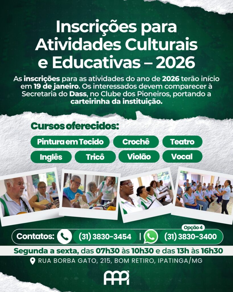 Inscrições abertas para as atividades culturais e educativas 2026. A partir do dia 19 de janeiro, na secretaria da Assistência Social (DASS), no Clube dos Pioneiros.